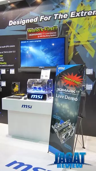 Di salah satu sisi booth-nya, MSI memajang live demo dari 3D Mark 11 yang masih berada dalam masa pengerjaan. Sesuai dugaan, logo MSI tampak pada beberapa objek di dalam game.