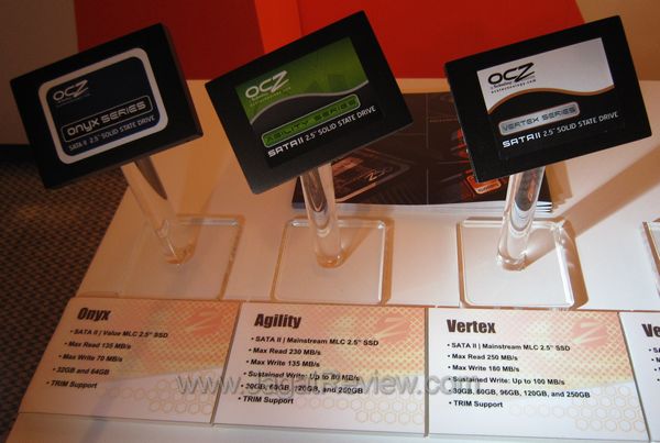SSD OCZ terbagi dalam beberapa seri. Pada gambar ini, kita dapat melihat SSD seri Onyx, Agility, dan Vertex. Onyx merupakan SSD kelas value, sedangkan Agility dan Vertex merupakan SSD kelas mainstream.