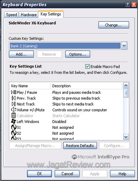 Untuk memudahkan gamer dalam memasukkan command rumit di dalam game, Sidewinder X6 menyediakan fungsi perekaman macro yang masing-masingnya bisa dialokasikan ke 30 tombol programmable. Selain melalui software IntelliType yang disediakan, programming macro dapat dilakukan dengan menekan tombol “record macro” di sisi atas keyboard. Sebanyak 6 buah tombol macro yang tiap-tiapnya bisa merangkap dua fungsi terdapat di sebelah kiri keyboard. Masih kurang? Tombol-tombol numpad pun bisa Anda gunakan untuk memasukkan macro. Cukup pindahkan keyboard ke mode “gaming” saja.