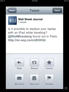 For the more traditional approach, a single tap takes you to a screen with a collection of buttons below the tweet that let you reply, retweet, favorite, send the tweet by mail, translate and an option to send a link to Instapaper or Read It Later. There is only the official retweet though, no option to resend as RT or quoted tweet.