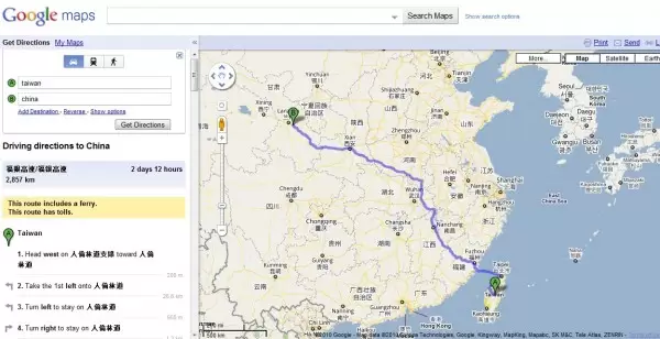 Memang sulit untuk menemukan “celah” dari sesuatu yang dikerjakan oleh Google. Berdasarkan dari temuan seorang teman, saya mulai sedikit meragukan keakuratan Google Maps, setidaknya saran rute yang ditempuh. Mengapa? Mungkin Anda bisa mencobanya sendiri. Yang perlu Anda lakukan hanyalah membuka Google Maps, memilih tulisan Get Directions, dan seperti imigran gelap yang berusaha masuk ke negara berpopulasi terpadat di dunia, kita akan memilih rute yang paling dekat jika kita ingin menempuh rute perjalanan dari Taiwan ke China daratan. Hasilnya akan tampak seperti ini :