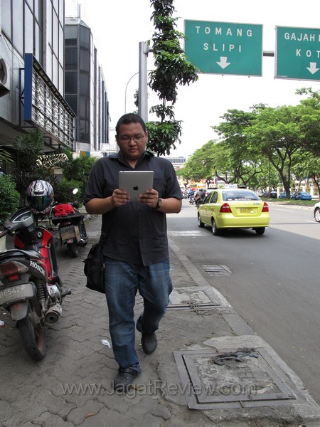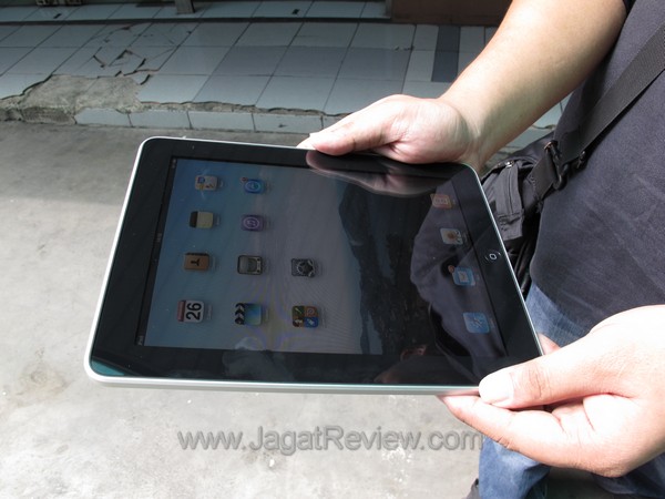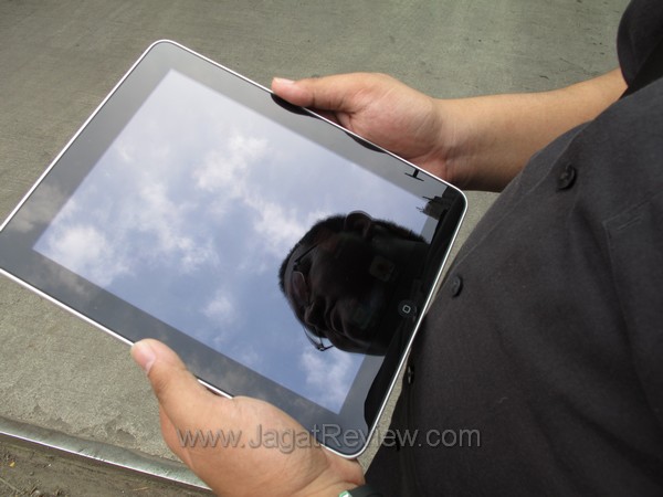Saat kembali ke kantor, saya sengaja berjalan kaki di tengah teriknya matahari Jakarta untuk mengetahui apabila layar iPad dapat dilihat dengan jelas saat berada di luar ruangan. Hasilnya? Layar iPad memang menampilkan gambar dengan sangat bagus di dalam ruangan. Akan tetapi, saat dibawa keluar dan berada dibawah sorotan sinar matahari secara langsung, tampilan pada layar sangat sukar dilihat. Menaikkan brightness sedikit membantu dan membuat tampilan menjadi lebih terlihat, walaupun masih terlalu gelap untuk dapat dilihat dengan nyaman.