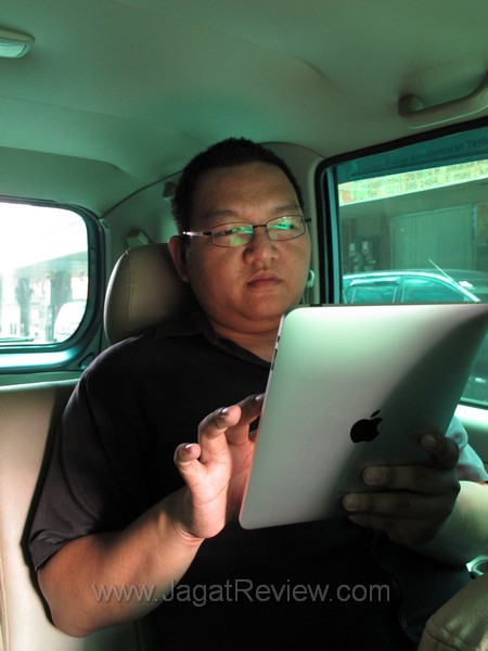 Saat di dalam mobil, saya dapat menggunakan iPad dengan lebih nyaman ketimbang saat berimpitan di bangku bus Transjakarta. Akan tetapi, ketiadaan koneksi 3G sekali lagi membatasi saya dalam menggunakan iPad di skenario outdoor ini. Saya memilih untuk mendengarkan musik, namun bentuk iPad yang terlalu besar untuk digunakan sebagai music player membuat saya enggan. Alih-alih menggunakan iPad untuk membaca e-book atau menjalankan aplikasi offline, saya memilih untuk memasukannya kembali ke dalam tas dan mengeluarkan iPod touch kesayangan saya untuk memutar beberapa lagu.
