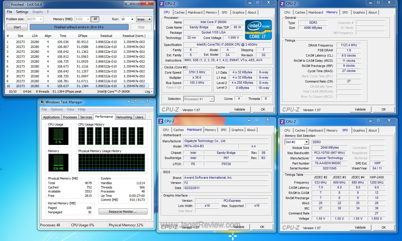 Memori yang cepat tapi tidak stabil tentunya bukan hal yang Anda inginkan. Kami juga berpikir hal yang sama. Maka, kami menyertakan pengujian stabilitas memori dengan menjalankan aplikasi LinX 0.6.4. Program ini bertujuan untuk menguji stabilitas PC dengan cara “menyiksa” CPU dan sistem memori kita dengan perhitungan floating-point yang rumit. Kami menjalankan tes ini selama kurang lebih 10 loop dan men-setting RAM Usage ke maksimal supaya semua area RAM yang tersisa bisa diuji.