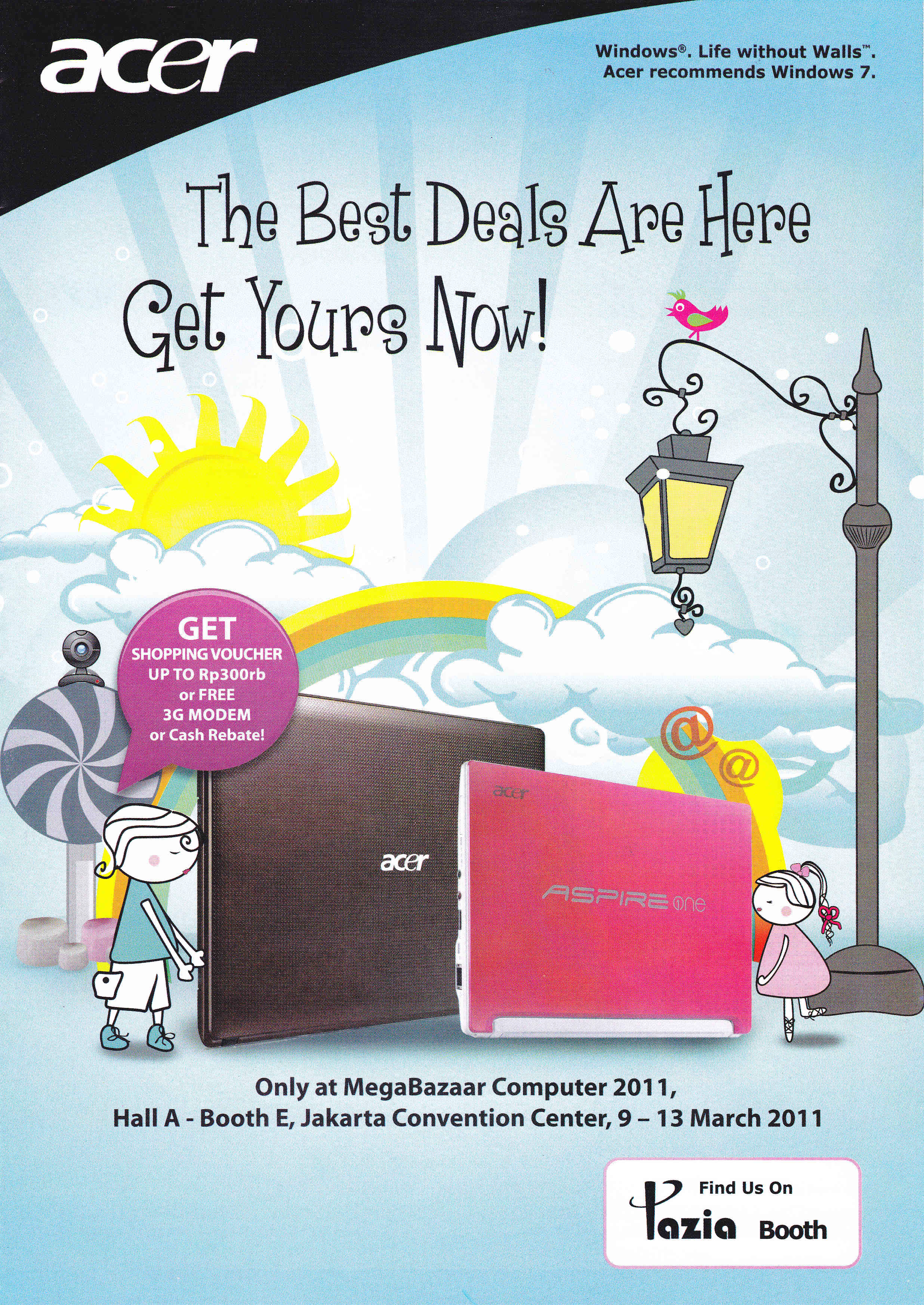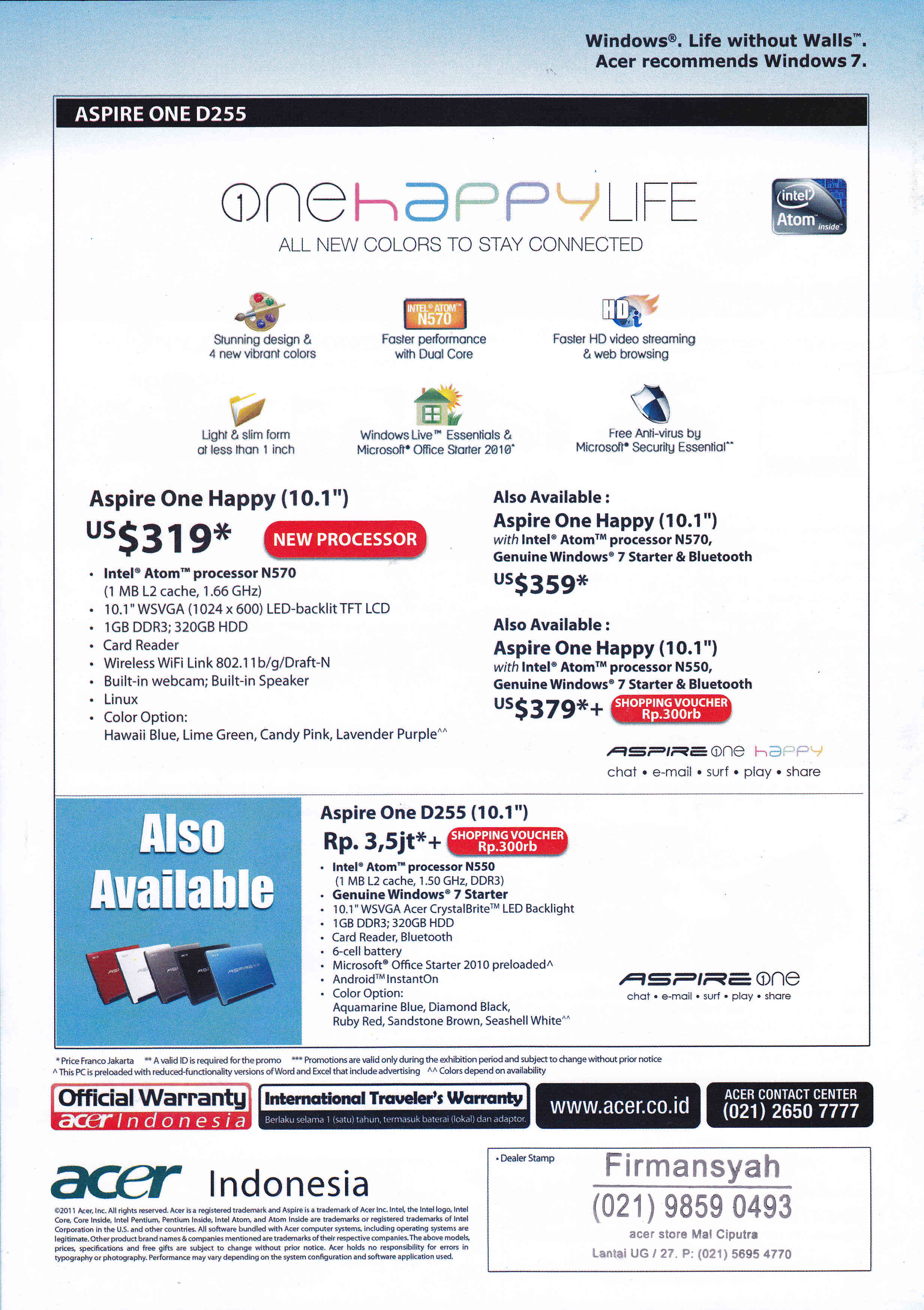 • Aspire One Happy (10,1″ with Intel Atom N550) + Genuine Windows 7 Starter + Bluetooth) : USD 379 (+shopping voucher Rp 300rb)