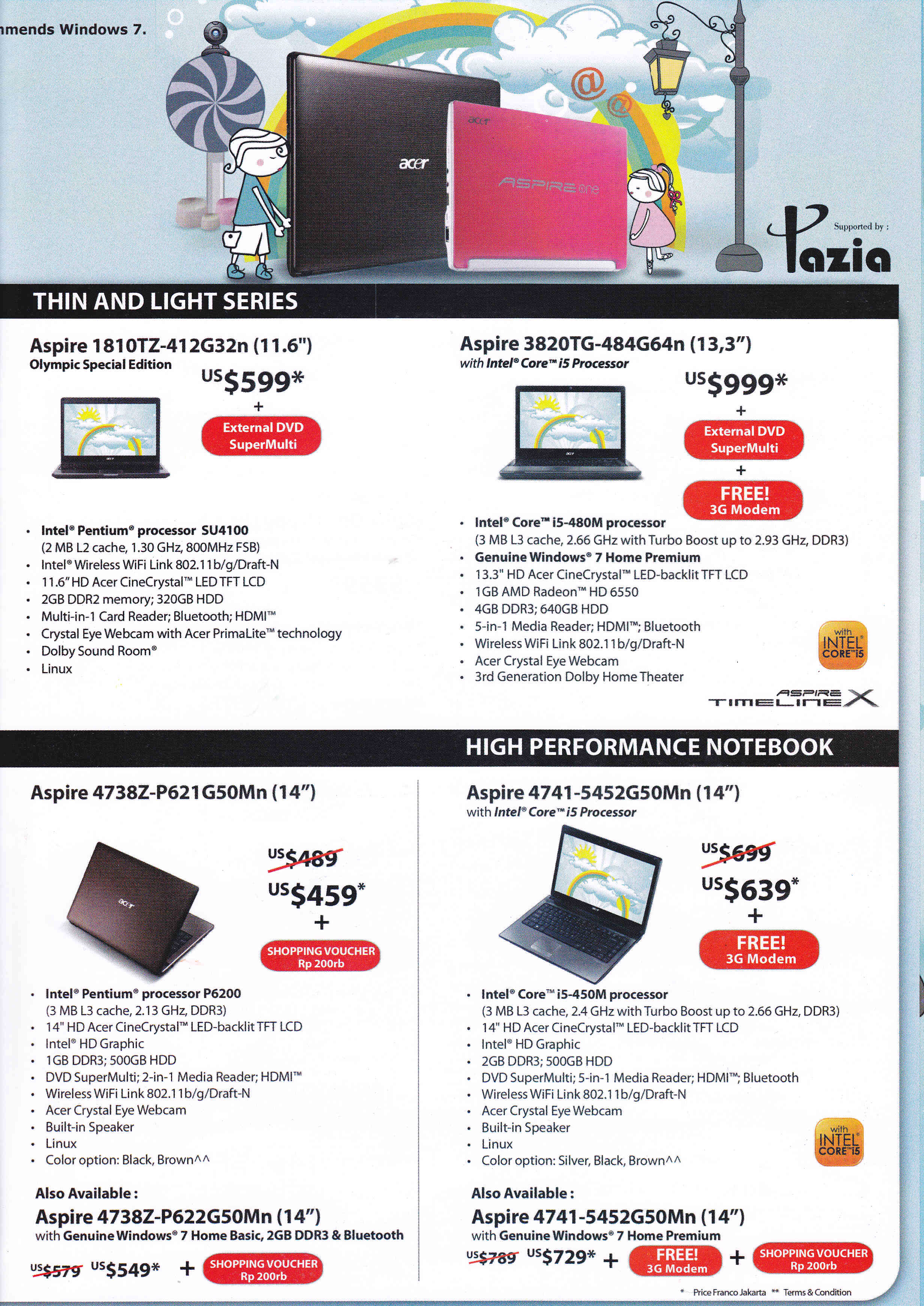 • Aspire 3820T-372G50n (i3-380M + Bluetooth) : USD 749 (+External DVD SuperMulti + Free 3G Modem + Shopping voucher Rp 1 juta)
