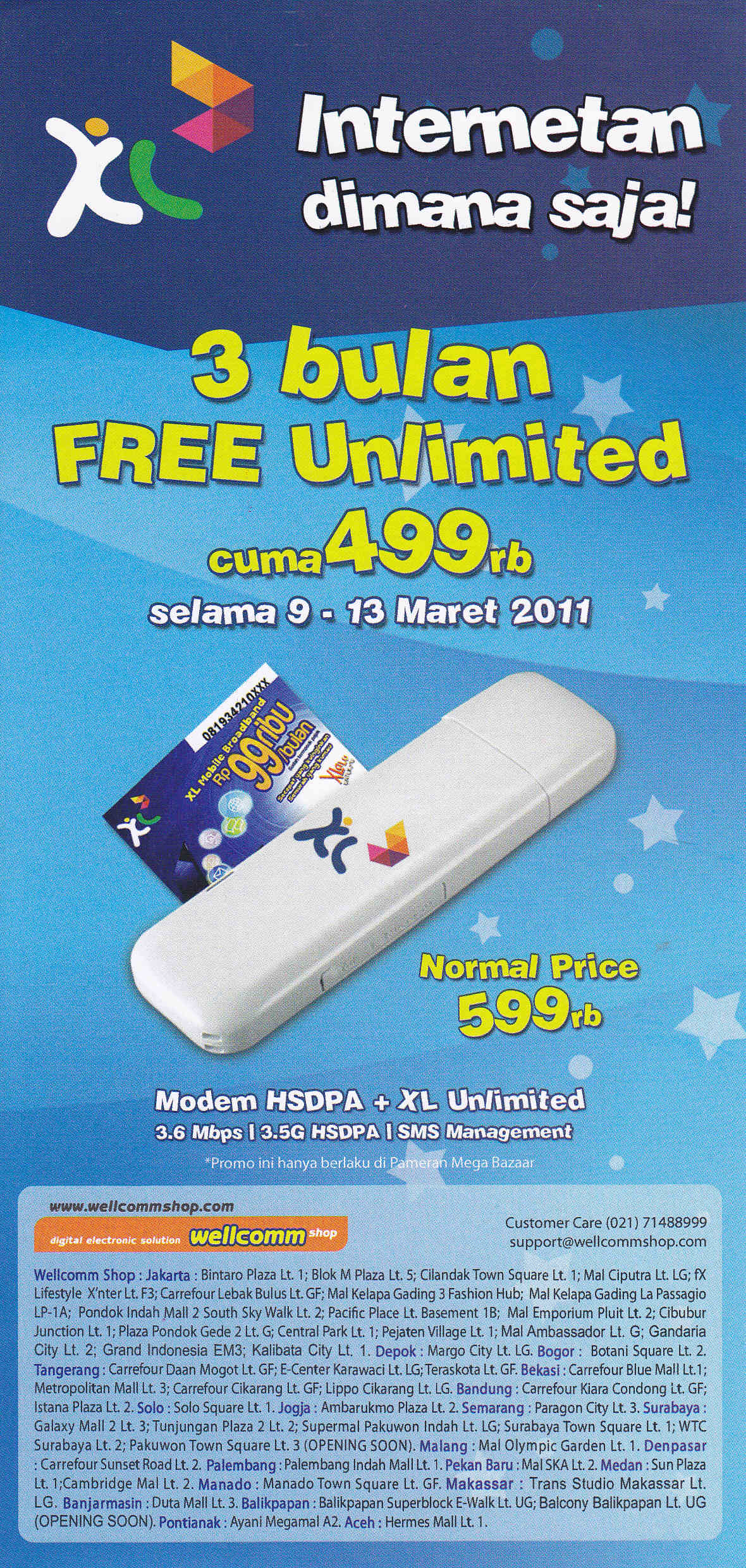 Dari harga normal Rp599.000,-, Anda berkesempatan untuk mendapatkan potongan harga cukup fantastis untuk produk XL HSDPA Modem selama promo MBC 2011 ini. Anda bisa membawa pulang modem ini dengan harga Rp499.000,- selama promo berlangsung + gratis 3 bulan unlimited internet.