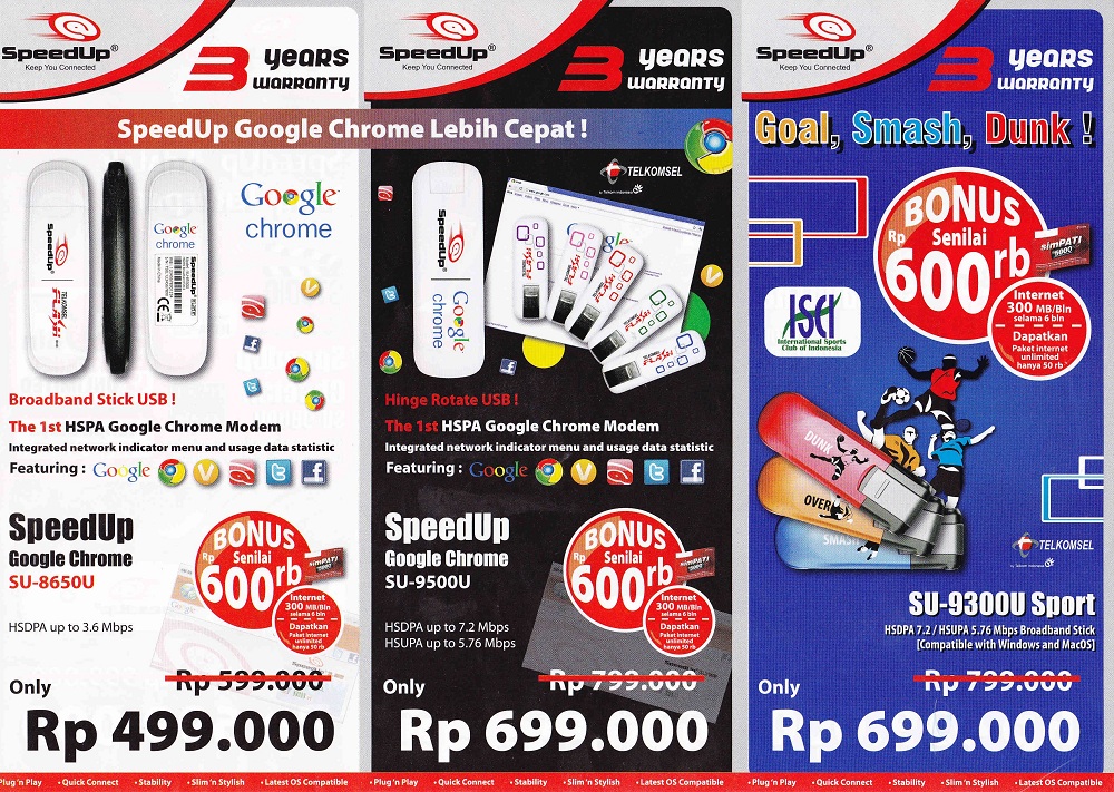 - SpeedUp Google Chrome (SU-9500U): Rp799.000,- menjadi R 699.000,- (Internet 300 Mb/bulan selama 6 bulan + dapatkan unlimited dengan hanya Rp50.000,-. Berlaku untuk kartu Telkomsel).