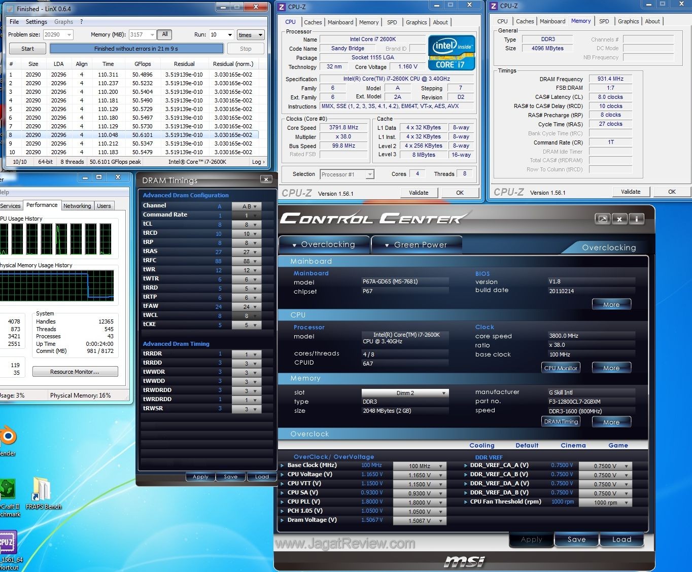 Perlu kami tambahkan sebelumnya, bahwa karena limitasi arsitektur Sandy Bridge(limitasi BCLK), pengaturan frekuensi kerja RAM menjadi terbatas, sehingga overclocking memori kami tidak bisa sebebas di platform X58 ataupun P55. (Anda yang tertarik untuk bisa mengetahui lebih jauh mengenai hal ini dapat membaca pembahasan kami pada artikel ‘5 Hal mengenai Sandy Bridge’)