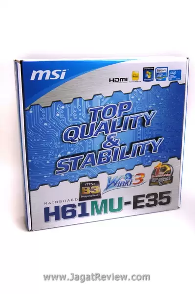 Inilah kemasan depanMSI H61MU-E35 (B3). MSI kembali menegaskan kualitas dan stabilitasnya dengan memajang dua mantra tersebut di kemasannya.