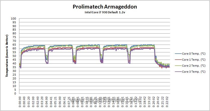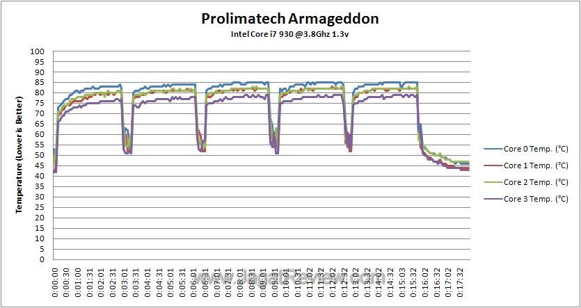 Karena tidak dapat memasang fan berukuran 120 mm, kami menguji heatsink ini dengan sebuah fan Noctua NF-P14 140 mm yang memiliki kecepatan maksimal 1200RPM. Di pengujian kali ini, kami juga melakukan komparasi performa Prolimatech Armageddon dengan heatsink DeepCool Ice Matrix 600 dan Thermalright Archon. Dalam kondisi default, performa Prolimatech Armageddon ini terlihat agak tertinggal dengan Thermalright Archon. Suhu maksimal yang dicapai terpaut sekitar empat derajat dan hanya terpaut kurang lebih dua derajat dari DeepCool Ice Matrix 600.