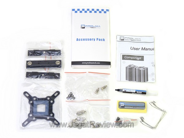 Tidak seperti heatsink lainnya yang seringnya dibungkus dengan kotak besar, Prolimatech menghadirkan sebuah kotak packaging yang unik dalam cara membukanya dan efisien dalam penempatannya sehingga kotaknya tampak kecil. Di bagian depan kotak ini, Anda juga akan menemukan desain yang tercetak di bagian atas heatsink ini.