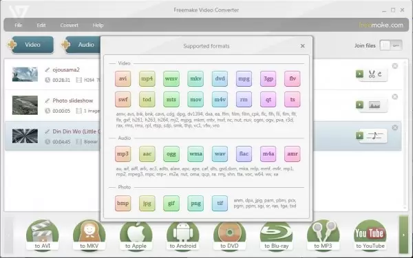 Freemake sendiri mengklaim bahwa aplikasi buatannya ini dapat mengonversi langsung dari website dengan cara kopi paste URL dengan dukungan lebih dari 40 website ternama. Sementara itu, aplikasi ini juga dapat digunakan untuk mengunggah video, audio, dan photo ke YouTube. Kelebihannya, aplikasi ini dapat memotong video menjadi beberapa bagian yang masing-masing berdurasi 15 menit ke dalam satu kesatuan di Youtube playlist secara otomatis.