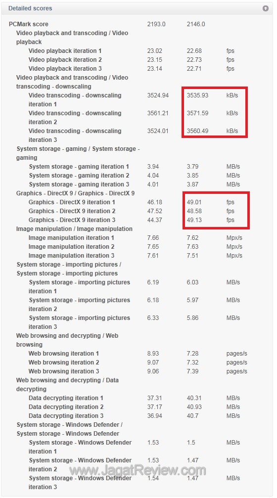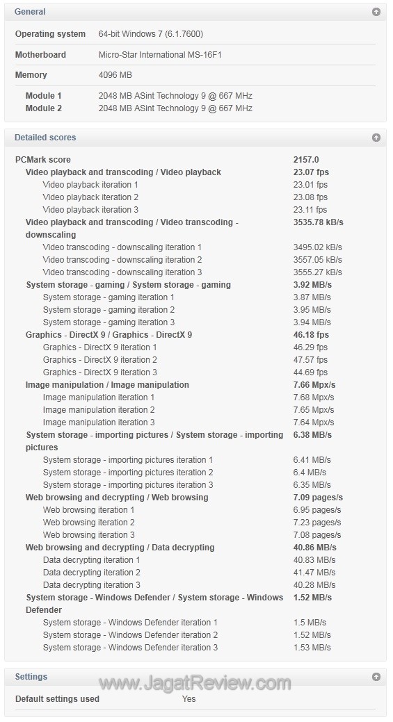 2) PCMark 7 menjalankan semua pengujiannya sebanyak 3 (kali) dan ini mengakibatkan hasil ujinya cukup konsisten. Dari sekitar 5(lima) kali run, kami hanya menemui perubahan minor (2-3 point dari total skor 2155).