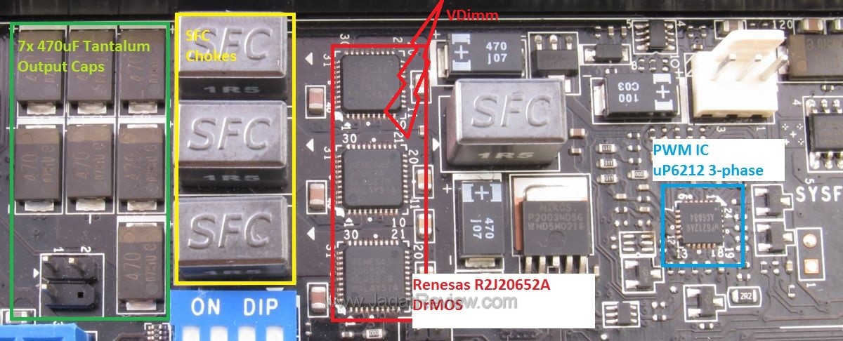 Mirip dengan CPU System Agent dan CPU IO, komponen low-power seperti RAM dan PCH (chipset P67) biasanya cenderung tidak membutuhkan daya yang tinggi. Kebanyakan motherboard hanya memberikan 1 atau 2 phase pada kedua komponen ini, namun sekali lagi MSI menggunakan desain 3-phase untuk masing-masing DRAM dan PCH, masih menggunakan Renesas R2J20652A DrMOS dan kontroller uP6212.