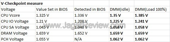 Nampaknya pada CPU VCore dan CPU IO Voltage, terdapat perbedaan sekitar 20-25mV antara voltage yang dideteksi di BIOS dan voltage hasil pengukuran di DMM kami. Pada saat CPU mengalami 100% load, tampak juga CPU VCore dan CPU IO Voltage meningkat lagi sebesar 20-35mV dari defaultnya.