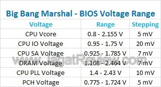 Berikut ini adalah list voltage yang bisa diatur melalui BIOS, kami juga menyertakan range dan stepping dari masing-masing voltage.
