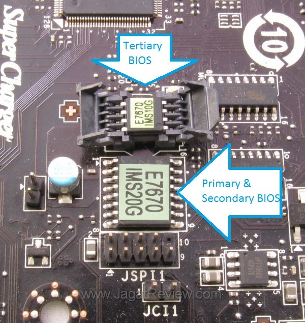 Board ini memiliki tidak hanya 1 (satu) BIOS, melainkan 3 (tiga) chip BIOS. Chip BIOS yang pertama, berisi 2(dua) buah BIOS, Primary dan Secondary, tapi user tidak bisa memilih BIOS primary maupun secondary, karena BIOS Secondary hanya aktif saat BIOS Primary rusak/corrupt. BIOS ke-3 berupa socketed IC dan bisa dipilih dengan menekan tombol ‘Multi-BIOS’ untuk menggantikan BIOS Primary.