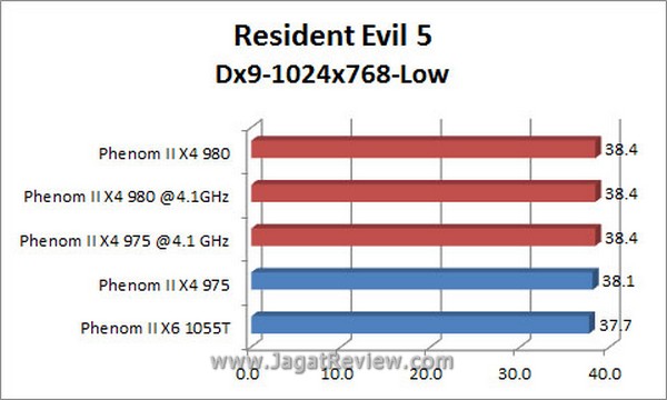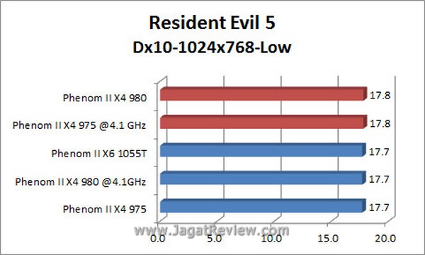 Pada benchmark Resident Evil 5 ini, hasilnya cukup bervariasi. Kami dapat menyimpulkan bahwa pada test ini, kemampuan prosesor terhambat oleh performa graphics card onboard yang kami gunakan dalam pengujian ini.