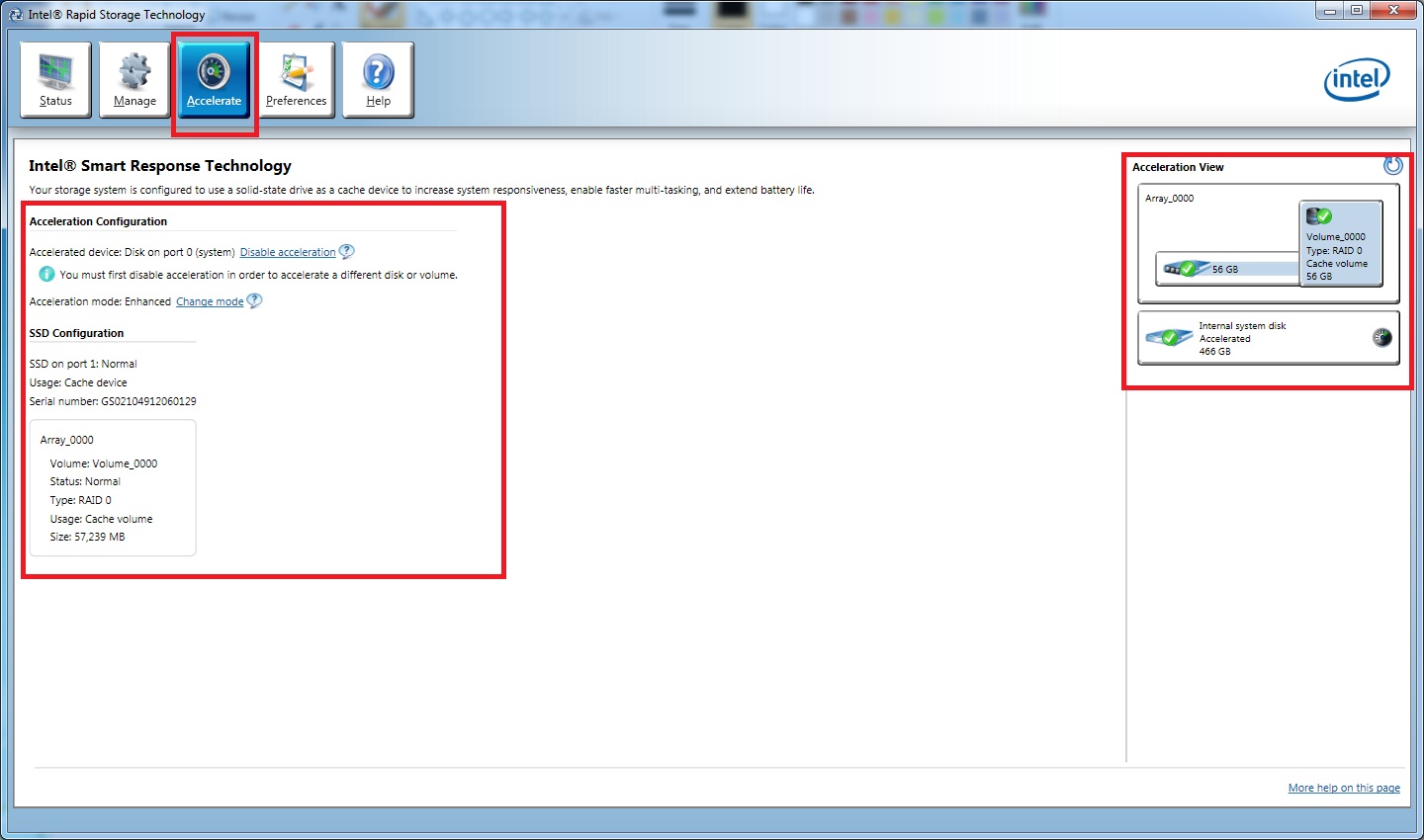 1) Jika konfigurasi sistem Anda benar, di control panel Intel Rapid Storage Technology akan ada pilihan “Accelerate”, seperti yang tertera di gambar di bawah ini.