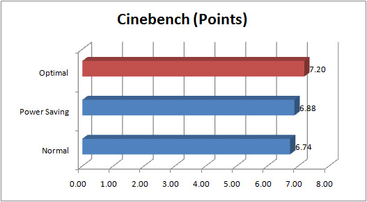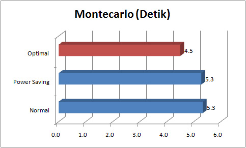 Hal yang sama didapatkan di aplikasi transcoding video ini. Konfigurasi “Optimal” membuahkan peningkatan kinerja cukup signifikan. Sementara, mode Power Saving yang memasuk voltase lebih rendah ke prosesor (sambil mempertahankan clockspeed yang sama) justru mencetak skor lebih tinggi dibandingkan mode Normal