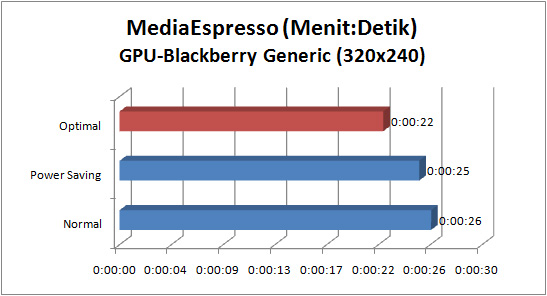 Terdapat dua skenario dalam pengujian. Pertama, video materi dikonversi menjadi 720×480 dengan format MP4. Kedua, video yang sama diubah menjadi format standar untuk Blackberry (MP4, 480×360). Hasil pengujian disajikan dalam satuan waktu. Semakin sedikit waktu yang dibutuhkan semakin baik.