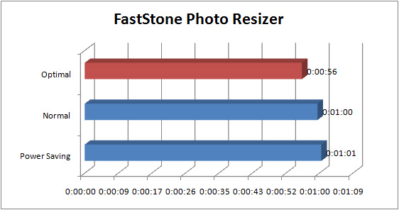 FastStone PhotoResizer merupakan batch-tool untuk melakukan prosesing gambar seperti resizing, croping, rotating, dan lain-lain. Pengujian dilakukan dengan me-resize kumpulan gambar berformat TIFF (66 files; 527 MB) ke format JPEG (Quality Level: 90) dengan resolusi gambar akhir sepanjang 600 pixel untuk sisi terpanjang. Proses resizing di aplikasi ini hanya menggunakan satu core (thread) prosesor. Oleh karena itu, clock speed sangat berpengaruh. Hasil pengujian disajikan dalam satuan waktu. Semakin sedikit waktu yang dibutuhkan semakin baik.