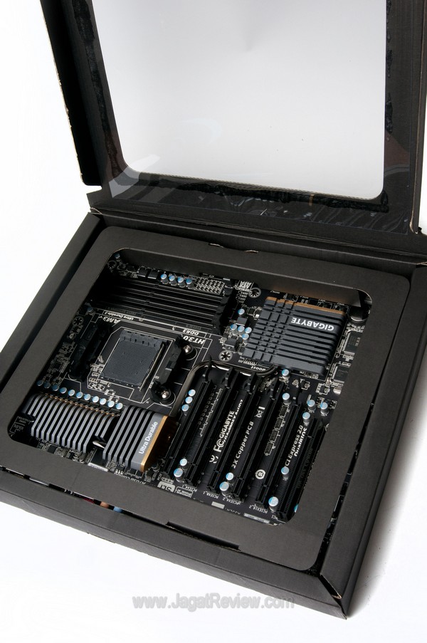 Motherboard yang dikemas di kotak terpisah dengan perlengkapannya.Kemasan motherboard.Layout motherboard terlihat tertata dan rapih. Tidak ada ruang yang terbuang percuma.Menggunakan color scheme hitam dengan sentuhan emas, sama seperti UD7 yang diperuntukkan untuk board Intel.