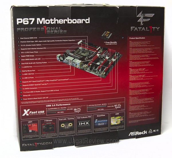 Seperti layaknya kemasan motherboard lainnya, bagian belakang kotak P67 Fatal1ty penuh dengan penjelasan fitur unggulan dan sekilas keterangan dari berbagai komponen motherboard tersebut.