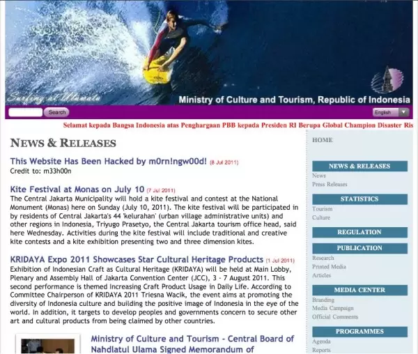 Halaman situs kementerian kebudayaan dan pariwisata Indonesia, www.budpar.go.id, dibobol oleh sekelompok hacker dengan nama m0rn!ngw00d. Identitas kelompok hacker ini belum diketahui. Namun, berdasarkan beberapa tampilan yang diciptakan di halaman muka situs tersebut, tampaknya m0rn!ngw00d berasal dari Malaysia. Halaman muka situs BudPar dihiasi dengan lambaian bendera Malaysia dengan keterangan mengenai aksi serangan dan nama hacker yang bertanggung jawab.