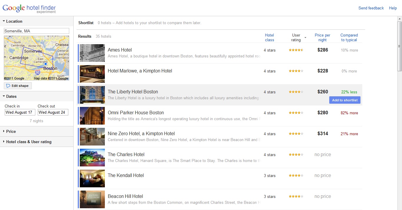 Bagi turis yang baru mengunjungi kota tertentu dan merasa bingung harus menginap di daerah mana, Google memberikan rangkuman tempat-tempat wisata yang terkenal di daerah tersebut. Hal ini dapat memudahkan pengguna dalam memutuskan daerah tempat penginapan mana yang tepat dengan tujuan wisatanya. Selain itu, pengguna juga dapat mencari hotel sesuai dengan kisaran harga yang mereka tentukan. Google bahkan memungkinkan penggunanya untuk membandingkan sejarah perubahan tarif harga hotel.