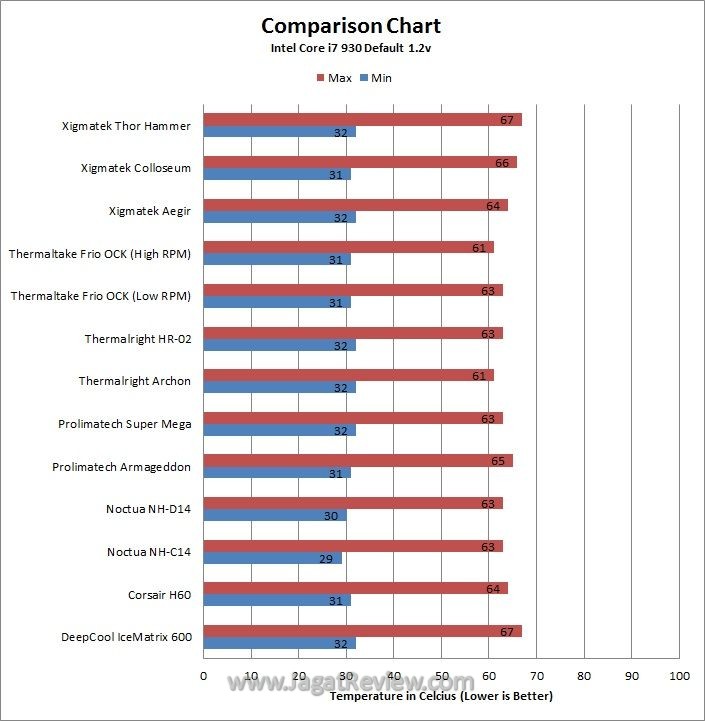 Selama pengujian, kami menyandingkan heatsink ini dengan sebuah kipas Coolermaster Sickleflow 2000RPM mengingat heatsink ini datang tanpa fan bawaan. Berdasarkan hasil pengujian kami, performa heatsink lansiran Xigmatek ini tampaknya tidak terlalu bersinar seperti nama Thor Hammer yang digunakan. Dalam kondisi default, suhu yang prosesor kami mencapai 67 derajat. Sedangkan dalam kondisi ter-overclock, suhu prosesor terjaga pada suhu 87 derajat dengan suhu maksimal 88 derajat. Penggunaan 2 layer heatpipe disini sepertinya tidak membantu banyak dalam meningkatkan performa heatsink tersebut. Secara keseluruhan heatsink ini mampu unggul 1 derajat dari Deepcool Ice Matrix 600 yang masih berada dalam kelas yang sama dengan rentang harga yang mirip.