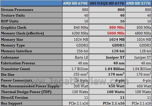 Pada dasarnya HD 6770 merupakan graphics card yang dapat dikatakan identik dengan HD 5770, baik dari segi fisik dan spesifikasi secara keseluruhan. Hanya saja HD 6770 sudah memiliki BIOS yang lebih baru dengan feature UVD (Universal Video Decoder) yang lebih baik. Untuk HIS IceQX HD 6770 Turbo sendiri, spesifikasi yang diusungnya sudah mengalami peningkatan (pre-OC) dengan core clock 880 MHz dan memory 5000 MHz (efektif) dari spesifikasi standar HD 6770 dengan clock 850/4800 MHz.