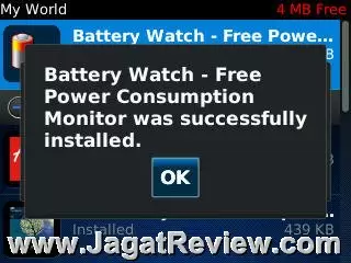 Layaknya aplikasi BlackBerry lainnya, Anda dapat download langsung aplikasi Battery Watch melalui BlackBerry Apps World. Aplikasi ini memiliki besar file di bawah 100 KB, tentunya utilities ini tidak akan memakan ruang pada media penyimpanan BlackBerry Anda. Proses instalasi pun sangat cepat, walaupun hanya menggunakan konektifitas GPRS.