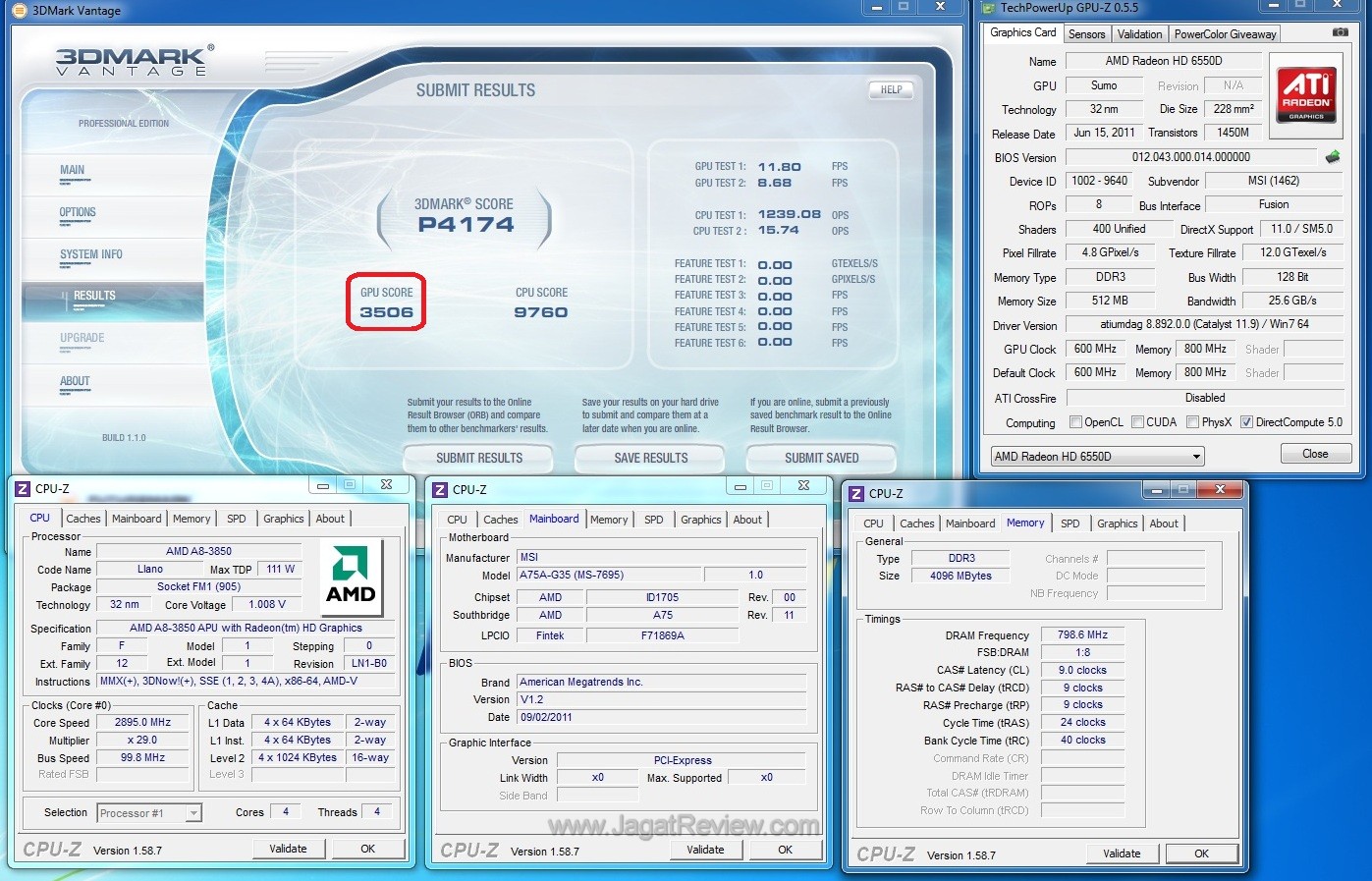 With its integrated Radeon graphics core, AMD A-Series APU (Llano) has no trouble keeping up with dedicated graphics cards like the ATI Radeon HD 3870. We were able to score 3500 points without overclocking the on-board GPU, as seen in the picture below: