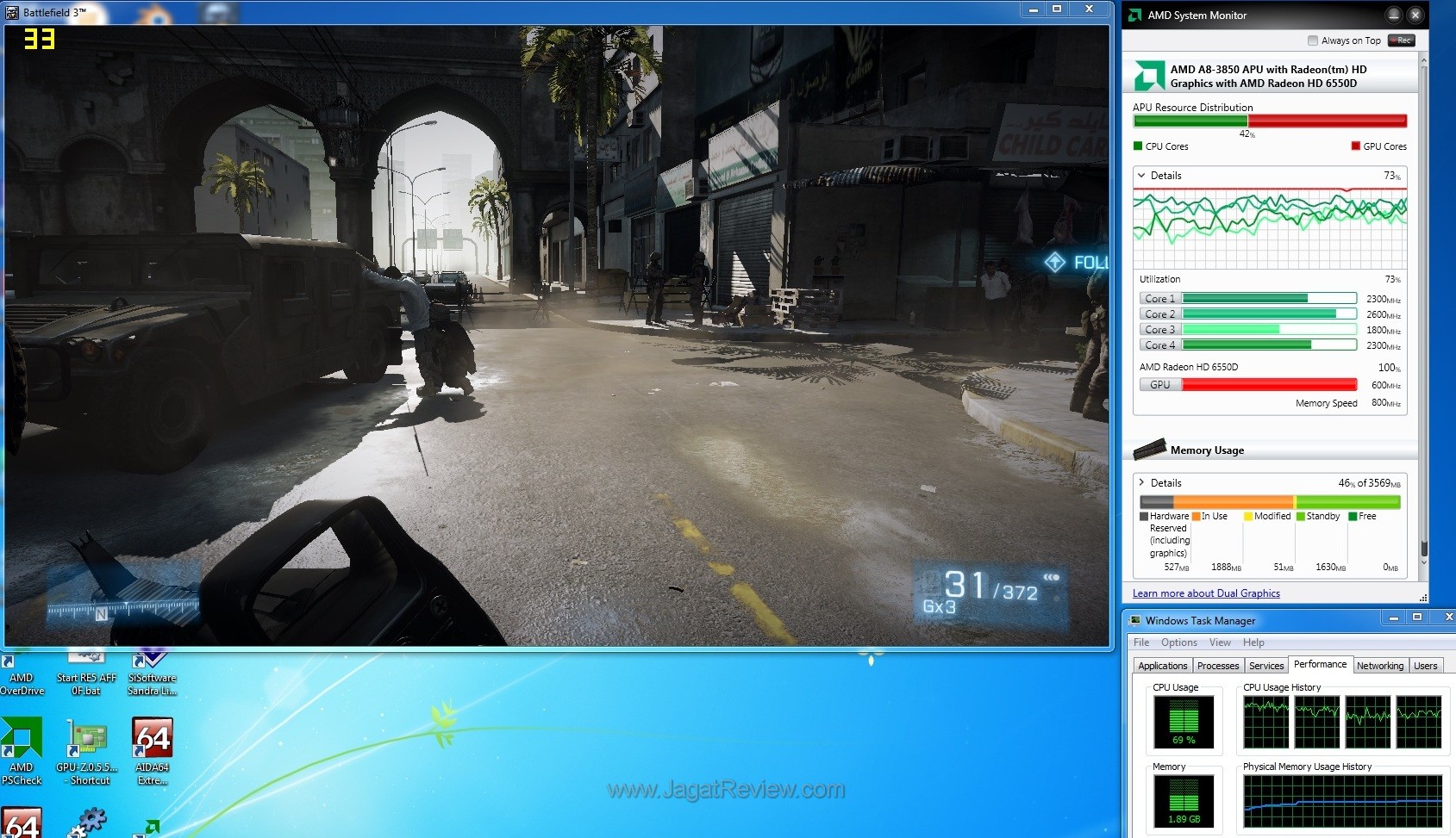 Additionally, here is BF3’s resource utilization as monitored by Task Manager and AMD System Monitor.