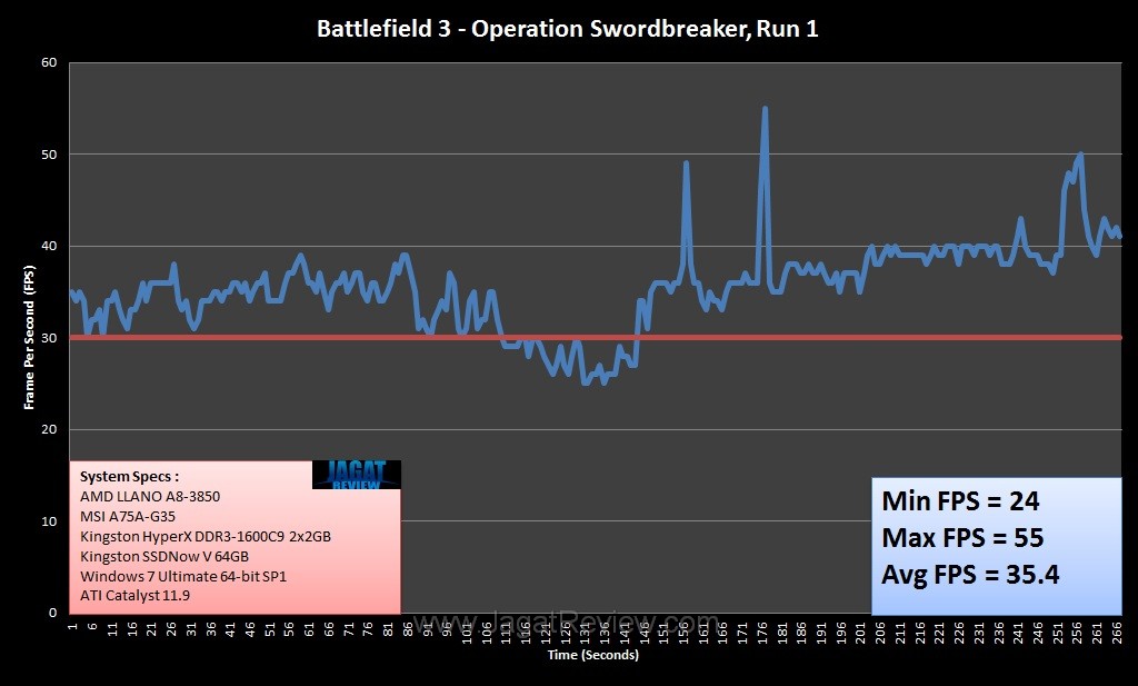 In BF3, the integrated Radeon GPU in AMD Llano once again proves itself to be the most powerful on-CPU graphics core, at least by the time of writing of this article. The frame rate occasionally drops to below 30 FPS, but most of the time, Llano managed to yield more than that. It’s worth noting that the scores from our system do not necessarily represent Llano’s true potential. For example, we weren’t running the memory modules at 1866 MHz. Also, the integrated GPU itself was not overclocked. Presumably, there is still some headroom left for tweaking. It’s possible to fork out, say, 20% more performance from Llano, but let’s save that for another time, shall we? Stay Tuned for more updates, only at JagatReview.com!