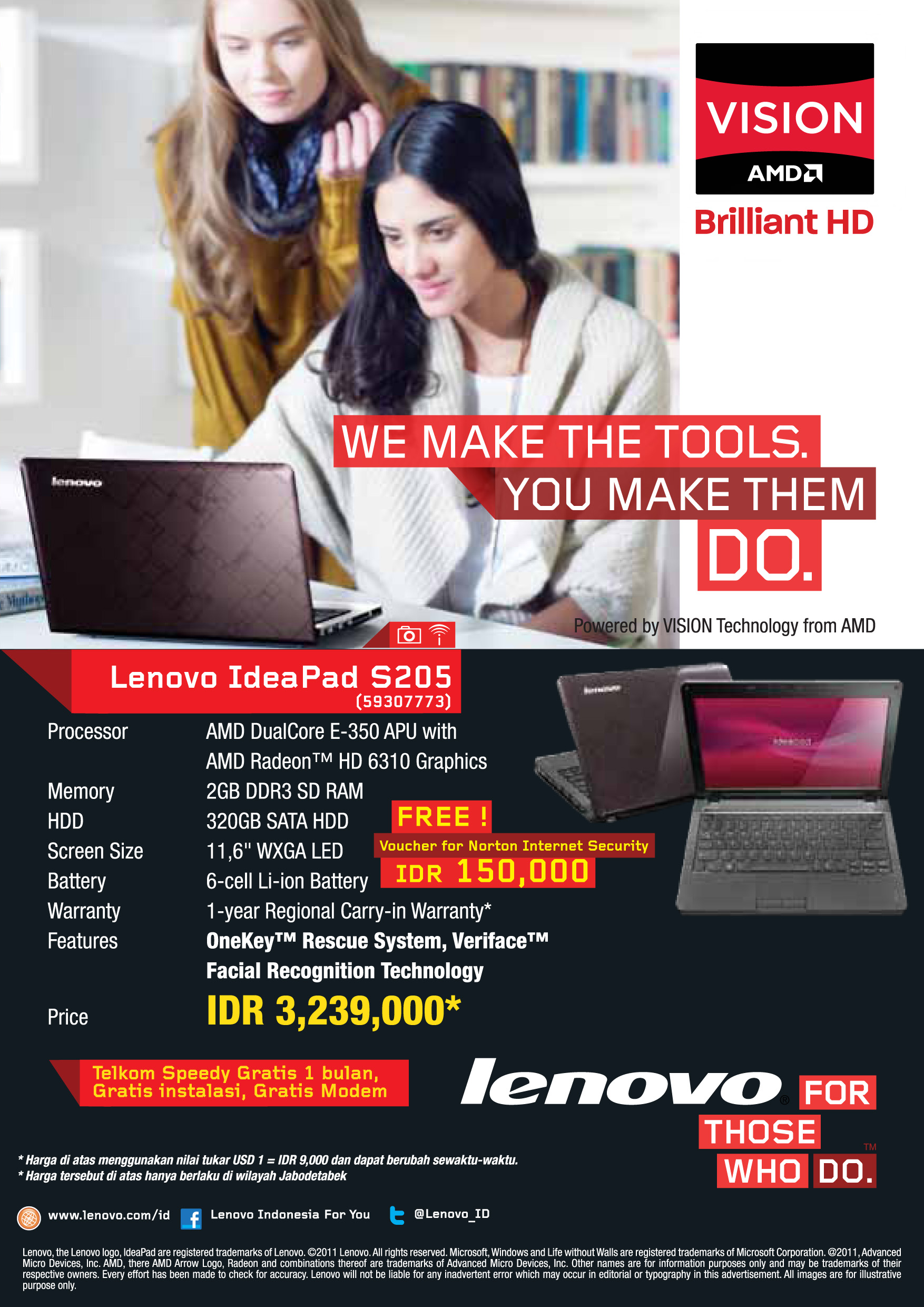 Lenovo IdeaPad S205: Rp3.239.000 ,- (+ voucher Norton Security Rp150.000,-)