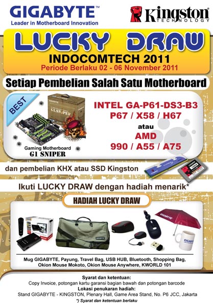 Setiap pembelian salah satu motherboard Intel GA-P61-DS3-B3 atau AMD 990/A55/A75 dan pembelian KHX atau SSD Kingston, akan mendapatkan kesempatan untuk mengikuti Lucky Draw yang berhadiah: Mug Gigabyte, Payung, Travel Bag, USB Hub, Bluetooth, Shopping Bag, Okion Mouse Mokoto, Okion Mouse Anywhere, Kworld 101.