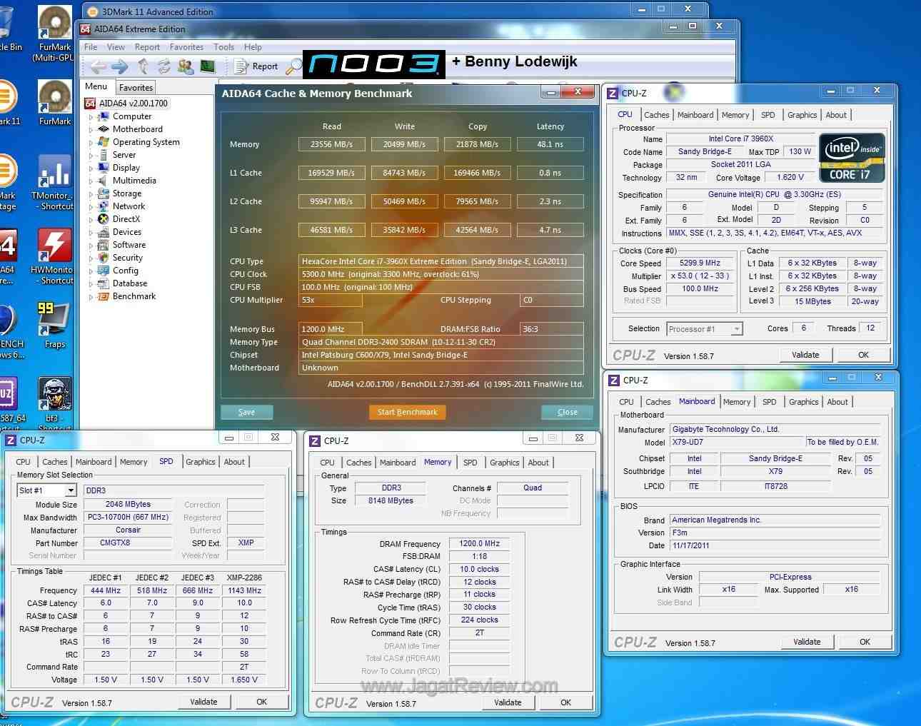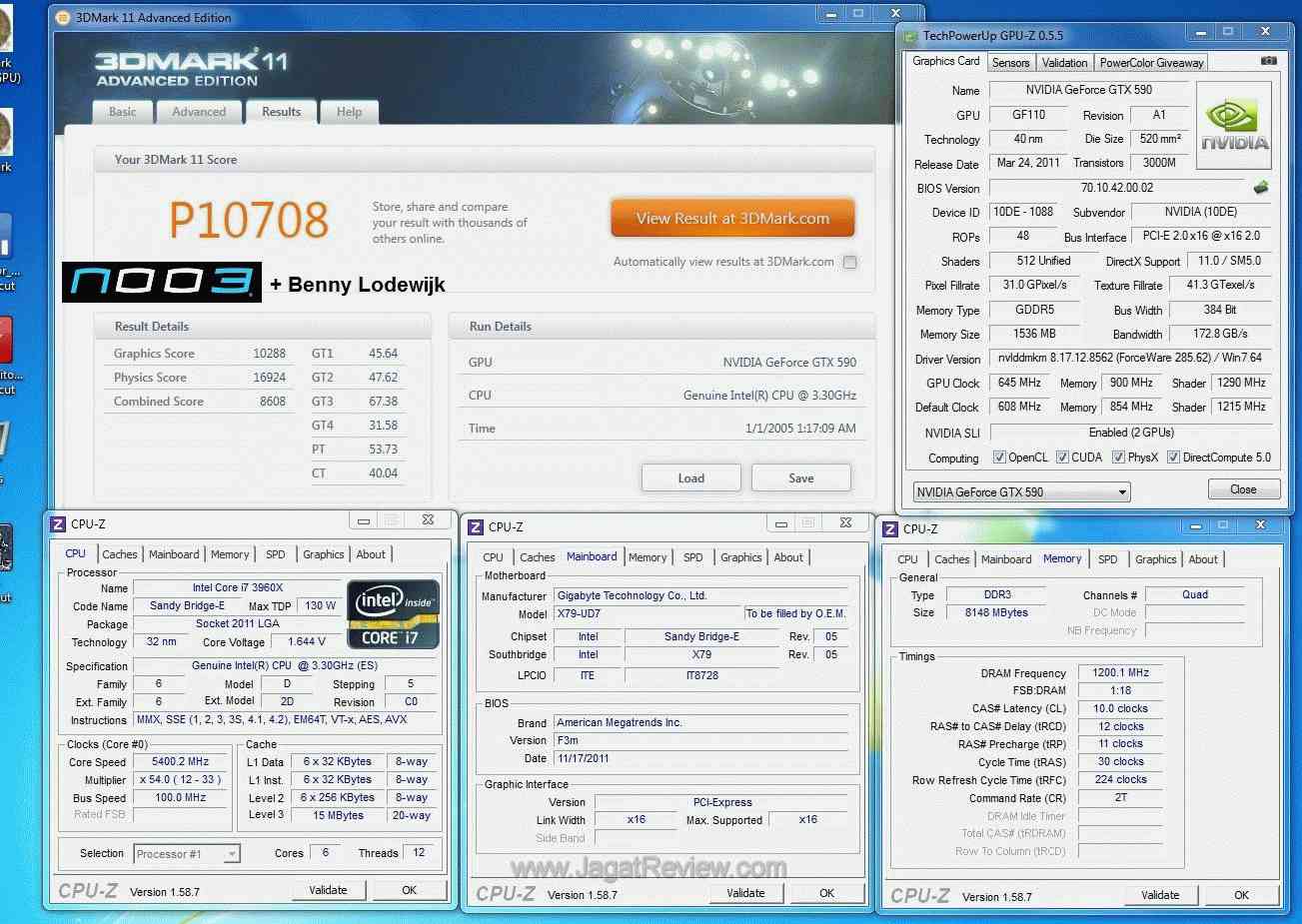 Setelah CPU dan RAM dioptimalkan, saatnya menjalankan benchmark 3DMark 11 dan 3DMarkVantage untuk melihat seberapa besar skor yang dapat diraih dengan Core i7-3960X + GTX 590 Quad-SLI!
