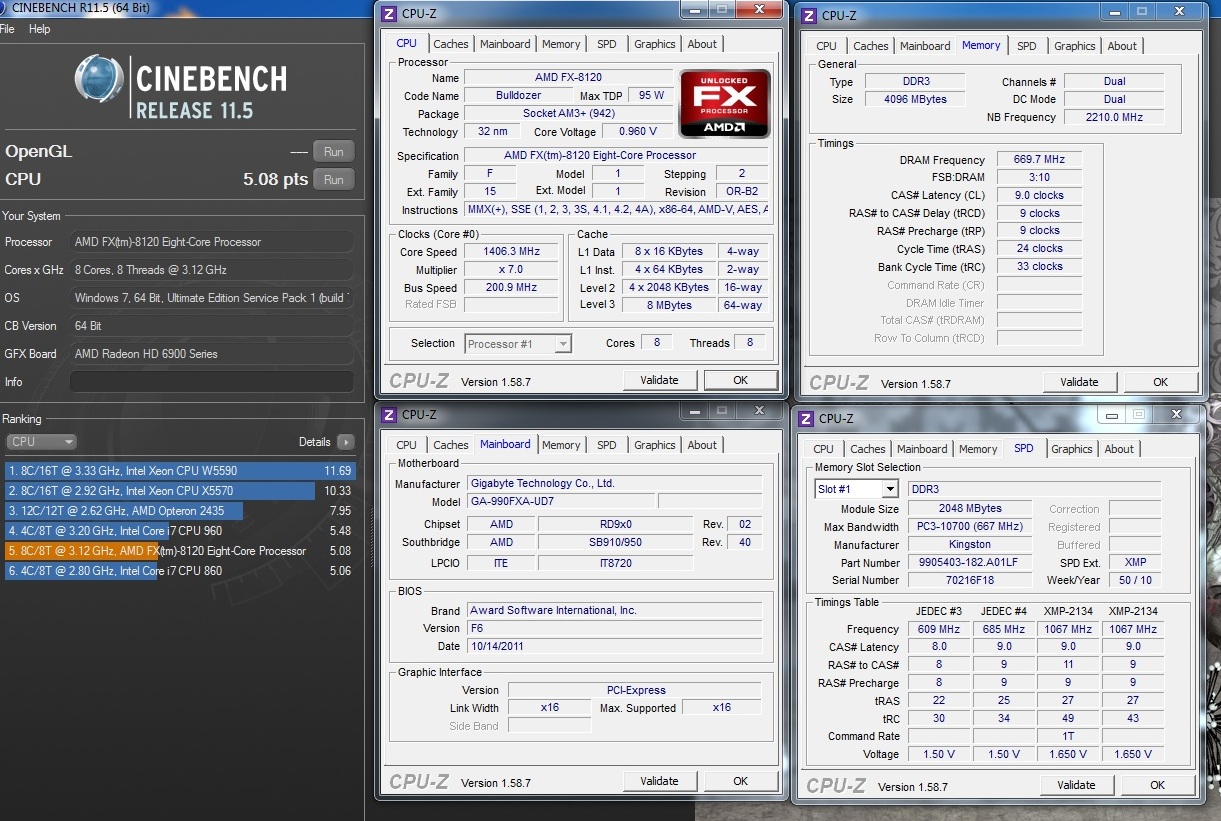 Cinebench R11.5, 3DMark Vantage dan 3DMark11 CPU test kami gunakan karena ke-3 benchmark tersebut dapat memanfaatkan kemampuan multithreading dari CPU yang diuji, sedangkan AIDA64 Cache & memory benchmark dapat mengukur bandwidth antara CPU dan Memory sistem.