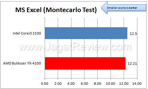 Pengujian dengan menggunakan Microsoft Excel ini menghasilkan skor yang tidak jauh berbeda. Tampaknya, kedua arsitektur mampu menawarkan performa yang tak jauh berbeda.