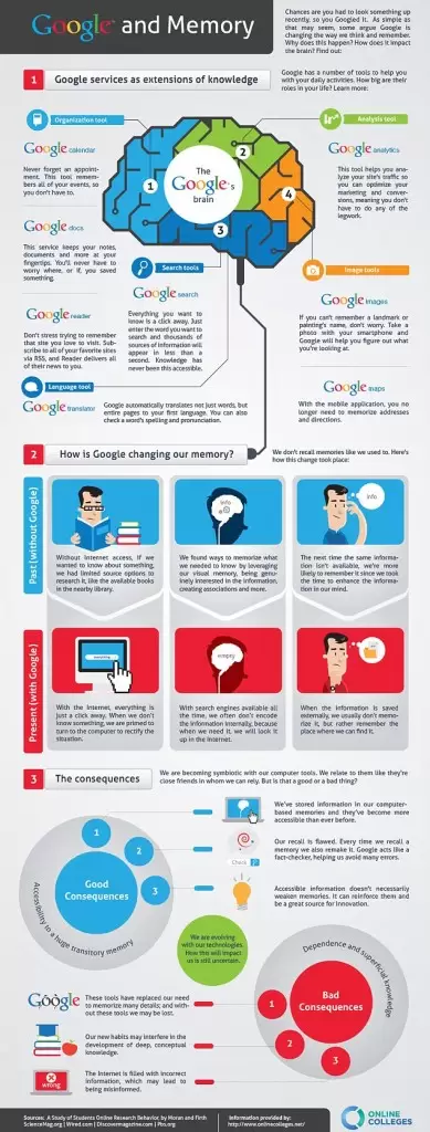 Banyak pihak yang menyatakan bahwa kehadiran Google di kehidupan manusia mengubah cara manusia dalam berpikir dan mengingat sesuatu. Deretan fitur yang dimiliki Google, mulai dari Google Images, Google Analytics, Google Calendar, Google Docs, Google Reader, Google Search, Google Maps, hingga Google Translator membuat hampir semua kegiatan manusia menjadi lebih mudah. Itu mendorong manusia sedikit demi sedikit mengubah pola berpikir mereka. Dari pola mengingat informasi yang dibutuhkan menjadi mengingat lokasi di mana mereka bisa menemukan kembali informasi yang dicari.