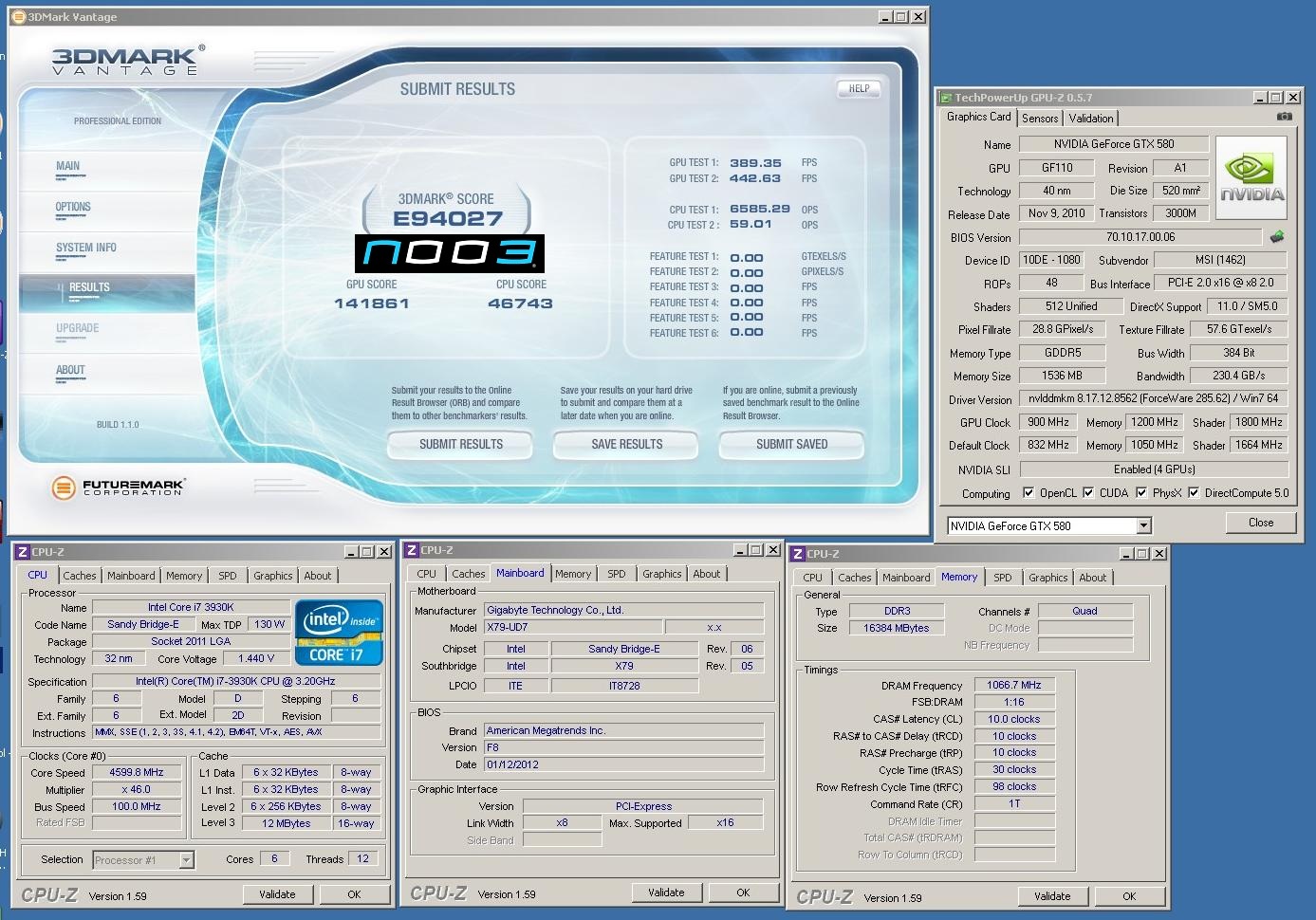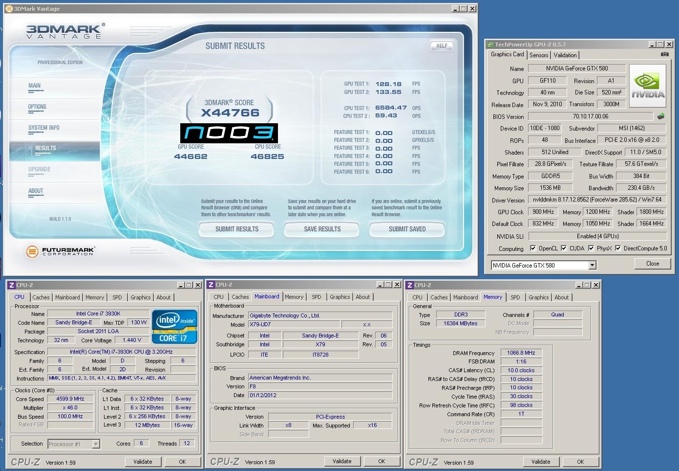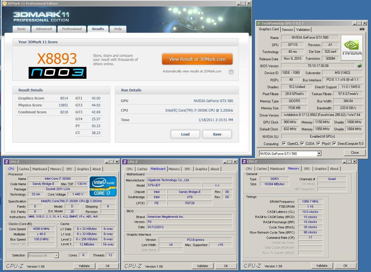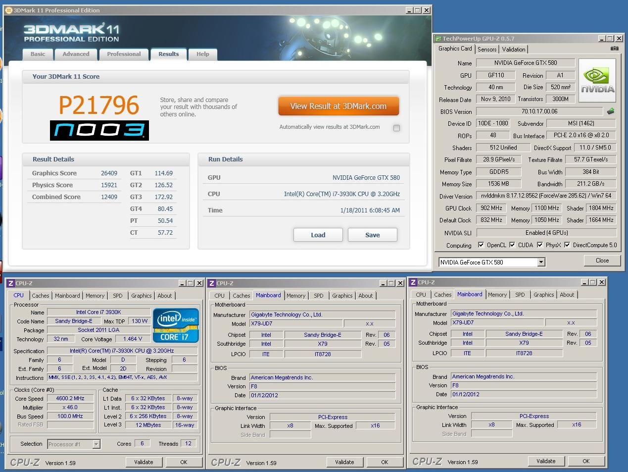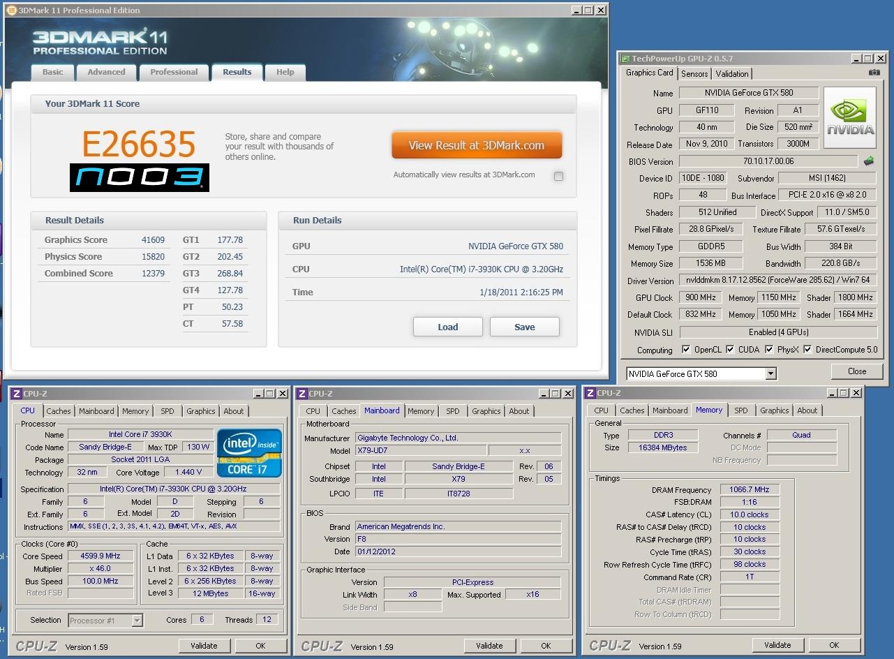 Dengan keempat core GTX 580 kami yang berjalan di 900Mhz, didapat hasil yang cukup baik pada benchmark 3DMark 11 dan 3DMark Vantage, skor yang kami dapat adalah :