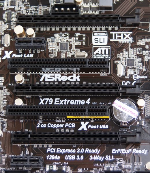Di sisi atas slot PCIe x16 pertama terdapat konektor daya molex untuk menyuplai daya tambahan ke slot PCIe saat menjalankan konfigurasi multi-GPU.