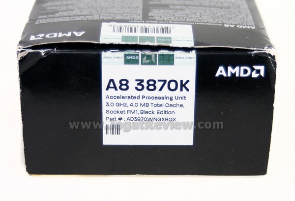 Sedangkan pada sisi atas kemasan, terdapat stiker yang berfungsi sebagai segel kemasan sekaligus menampilkan informasi spesifikasi prosesor. AMD A8-3870K BE dilengkapi clock speed sebesar 3 GHz dan chace sebesar 4 MB. Spesifikasi ini 100 MHz lebih tinggi dibandingkan A8-3850 yang dilengkapi clock speed sebesar 2.9 GHz.