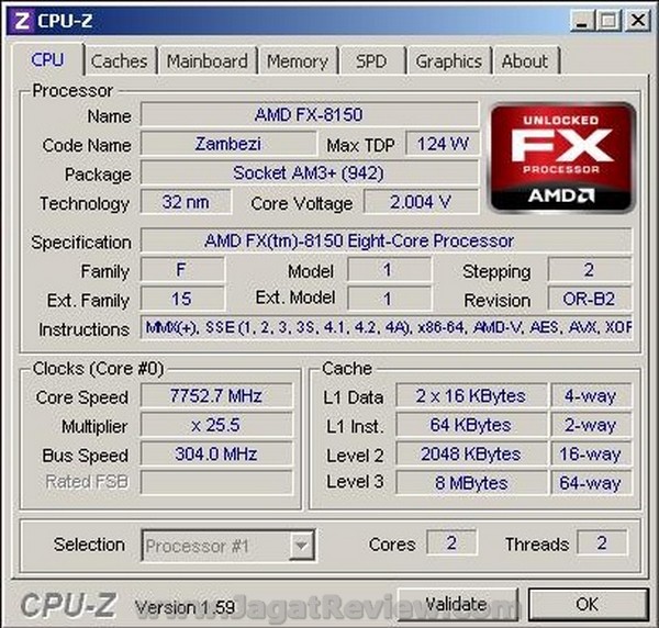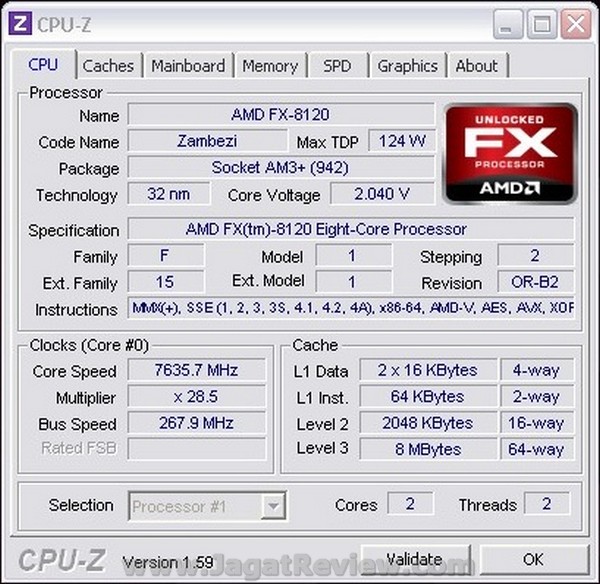 Kami tidak bisa mem-validasi kedua hasil CPU-Z diatas, karena kami menggunakan CPU-Z 1.5.9 pada saat pengujian berlangsung. Pada saat artikel ini ditulis, semua validasi CPU-Z harus menggunakan versi 1.6.0. Dengan cooling Liquid Nitrogen dan voltase diatas 2 V, kedua prosesor tersebut tidak mengalami masalah untuk berjalan di kecepatan di atas 7Ghz. Prosesor FX-8120 kami menemui clock tertingginya pada 7.6Ghz, sedangkan FX-8150 kami bisa mendapat clock 7.7 Ghz. Sayang sekali tidak ada CPU kami yang bisa berjalan di 8Ghz ke atas.