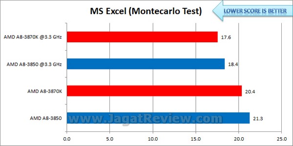 Benchmark workload Montecarlo pada Microsoft Excel mencoba menyimulasikan pengerjaan perhitungan rumit yang tentunya membutuhkan kinerja prosesor yang cukup besar. Pada benchmark ini terlihat bahwa A8-3870K dalam keadaan dioverclock pada kecepatan 3.3 GHz mampu mengungguli A8-3850 pada kecepatan yang sama. Dalam keadaan standard perbedaan 100 MHz yang dimiliki kedua prosesor di atas menghasilkan perbedaan performa sebesar 4%.