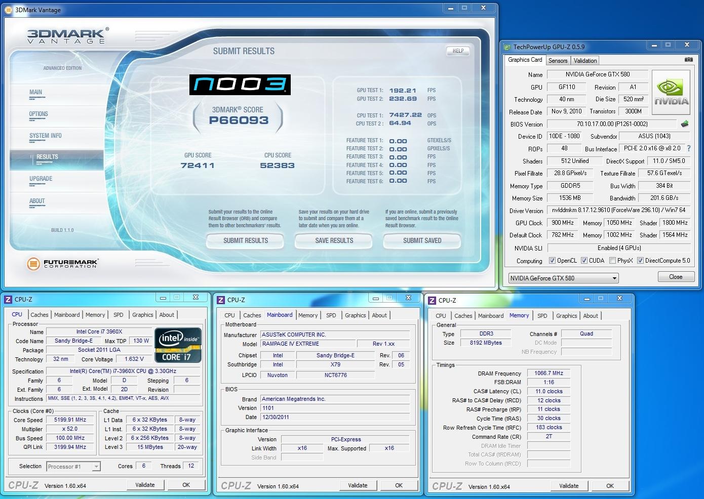 Kemudian, dengan sisa 15L LN2 kami menjalankan beberapa benchmark 3D seperti 3DMarkVantage dan 3DMark11(kesemuanya menggunakan Performance preset) dengan CPU kami berjalan di 5.2Ghz dan keempat VGA kami berjalan pada Core clock 900Mhz dan Memory Clock 1050Mhz.