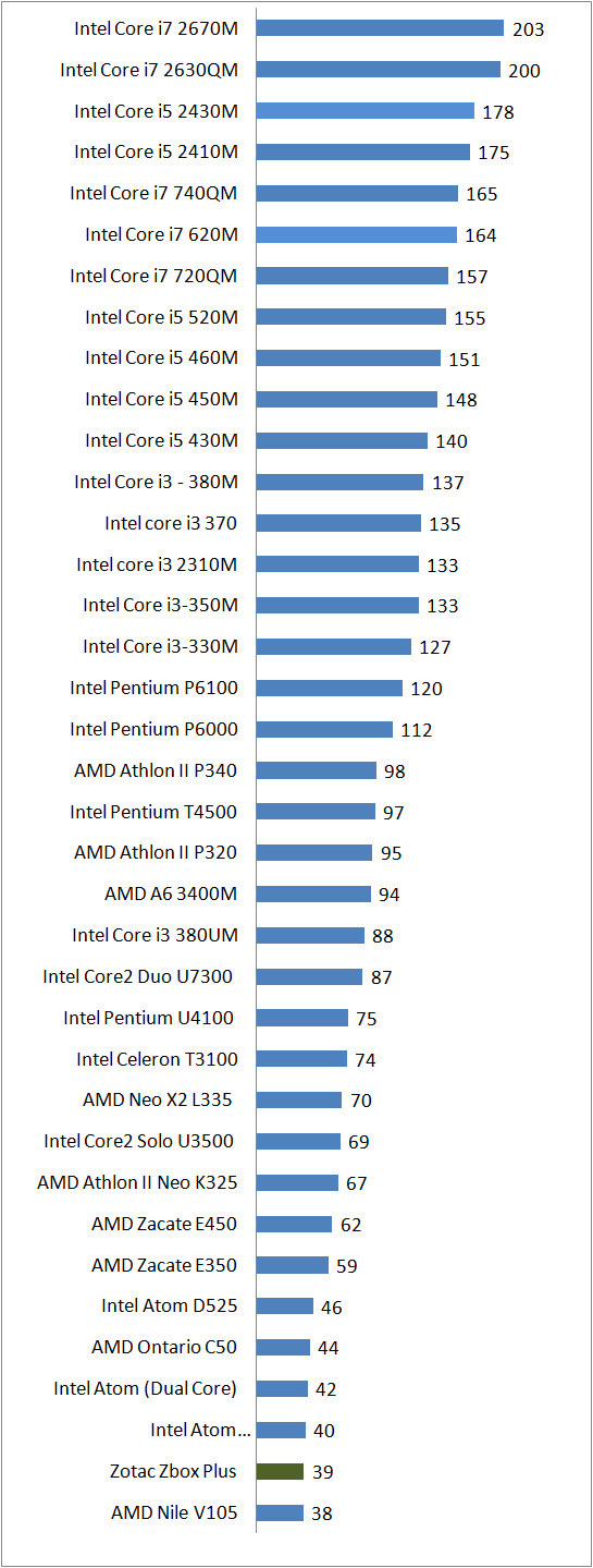 Paduan prosesor Atom D2700 dan chipset Intel NM10 Express pada Zbox ID80 Plus ternyata menghasilkan kinerja yang masih berada di bawah tingkat performa prosesor-prosesor lain dalam kelasnya. Meski begitu, nettop ini sanggup memainkan file video full-HD (1080p) tanpa masalah.